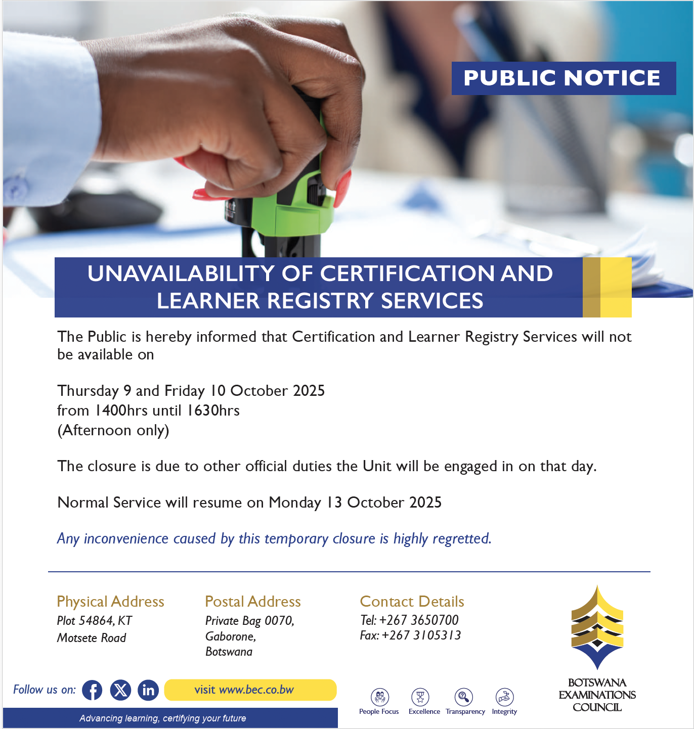 • Letter from Customary court (Kgosi/Chief) or letter from Department of Civil and National Registration office for Surname difference (For instance, Marriage certificate)