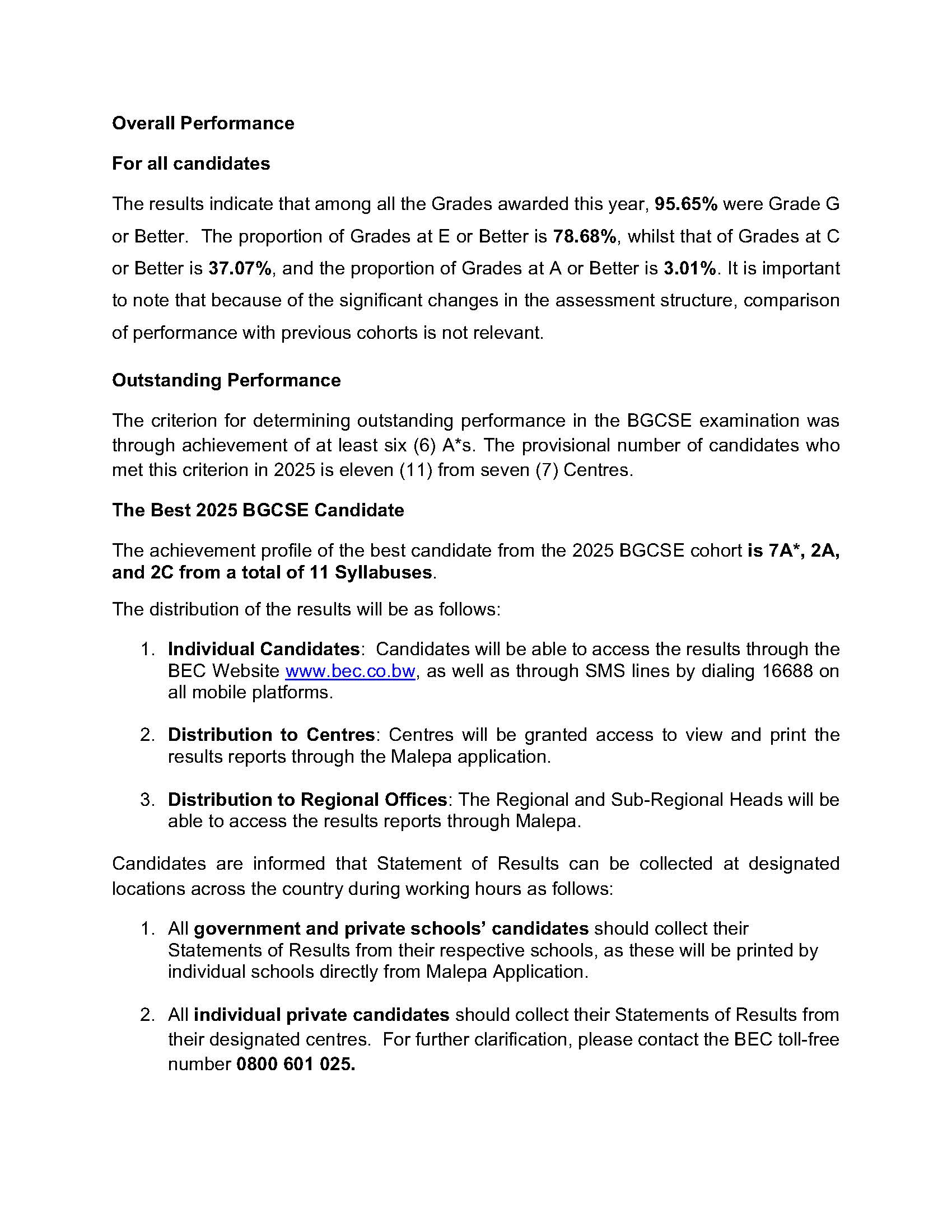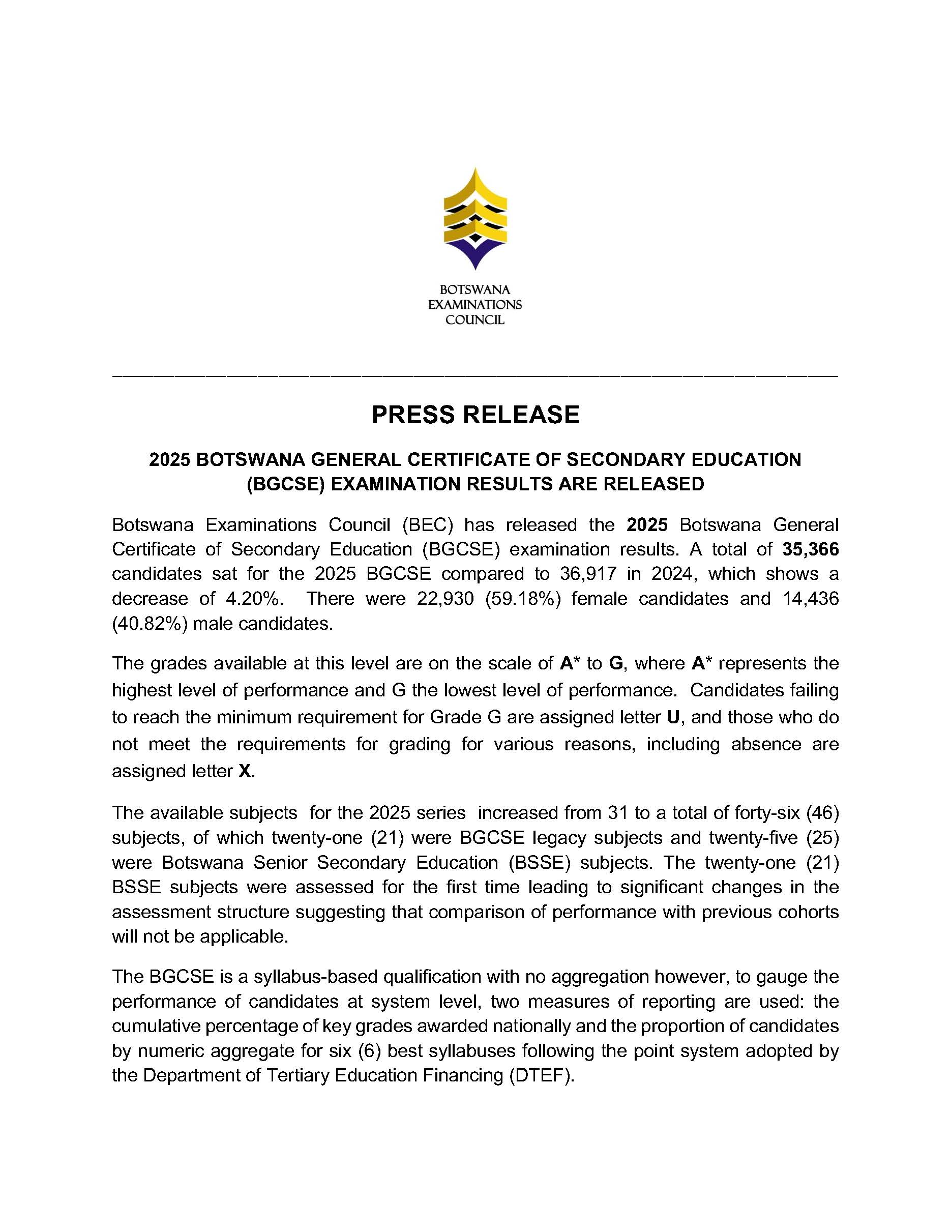 BEC is mandated under section 5 of the Botswana Examinations Council Act (Act No 11 of 2002) as amended by the Botswana Examinations Amendment Act, 2019 to manage, conduct examinations and assessments in general education and technical, vocational education and training and to award certificates in respect of the said examinations and assessments.